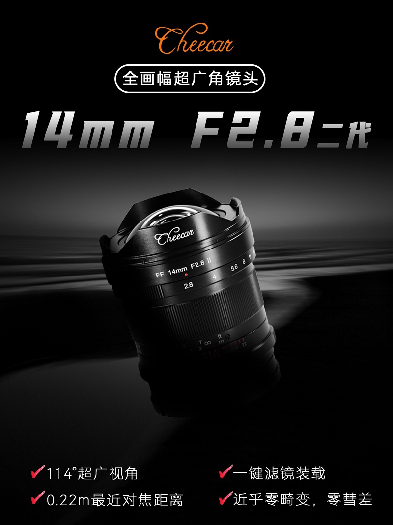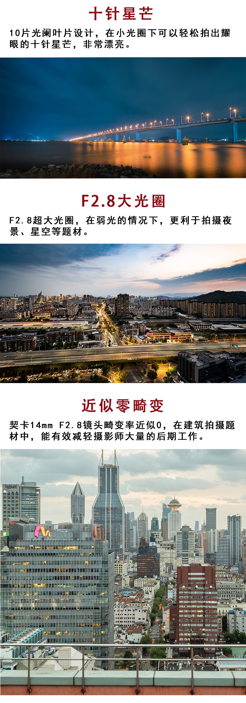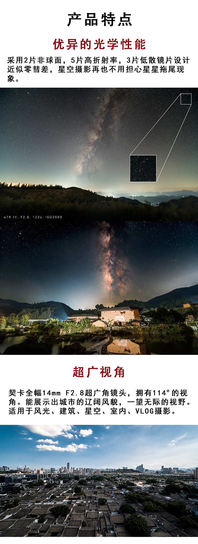 契卡全畫幅14mm F2.8二代鏡頭近乎零畸變、超廣角、大光圈鏡頭,掃街、風(fēng)景、星空拍攝法寶。每片鏡片均采用低反射多層膜,消除了鬼影和眩光,鏡頭用了2片非球面鏡片,有著114°的視場(chǎng)角,是一只極具特色的10針星芒超廣鏡頭,支持的卡口為E/Z/RF/L/。